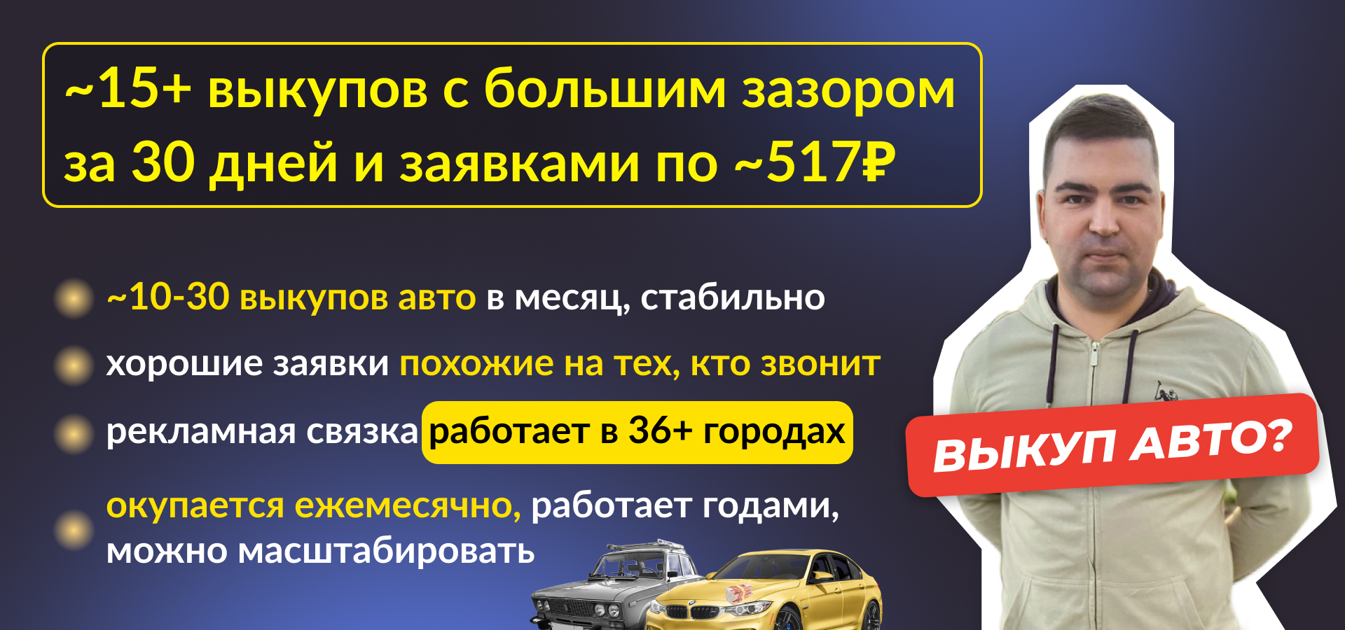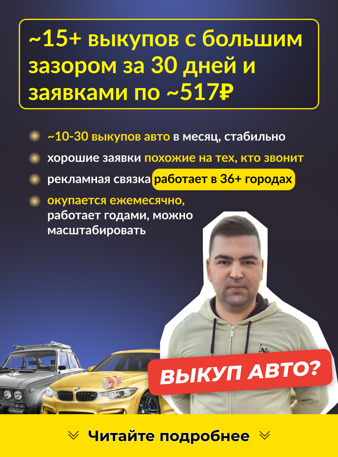 ~15+ дополнительных выкупов с большим зазором за 30 дней и заявками по 517₽ — проверенная рекламная связка «Авиджет», которая годами приносит клиентов перекупам авто в 36+ городах. Заявки через 3-5 дней.