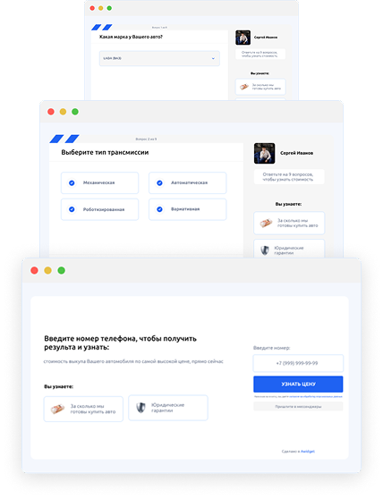 Чтобы узнать цену, ваши потенциальные клиенты отвечают на несколько вопросов квиза и оставляют свой номер телефона, чтобы с ними связались и сориентировали по стоимости выкупа. По номеру телефона звонят те, кому нужно продать СРОЧНО.