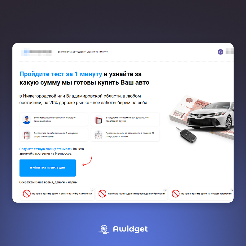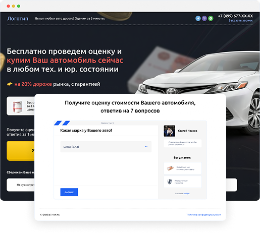 На квиз-сайте ваши потенциальные клиенты видят ваше предложение, преимущества, призыв к действию, номер телефона, калькулятор оценки стоимости выкупа автомобиля.