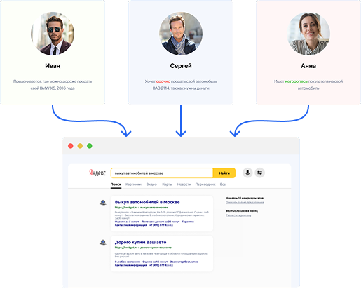 Реклама в Яндекс.Директ – объявления показывались только тем, кто ищет «срочно продать авто», «продать машину сегодня».